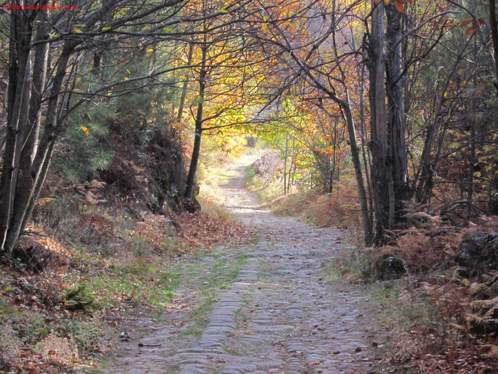 Tomamos, por tanto, el sendero que va en sentido descendente. Desde el inicio apreciamos que el camino es una calzada romana, aunque en muchos puntos está cubierta por hojas. La calzada medieval era el nexo de unión entre la provincia de Salamanca y el Valle de Jálama.