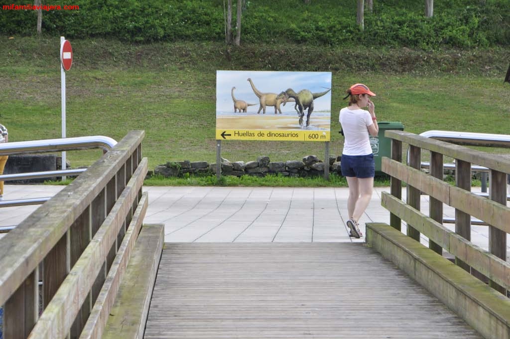 El sendero está acondicionado con barandillas de madera y no tiene pérdida. Al final del recorrido hay un mirador que permite ver las huellas de dinosaurio más grandes de Asturias, y una de las mayores del mundo. La icnita alcanza la longitud de 130 cm y es de un saurópodo que habitó esta zona hace más de 150 millones de años. También se pueden observar icnitas de tres dedos (tridáctilas) de un terópodo. Aunque en este caso, los restos fósiles pertenecen a un animal de menor tallaje.